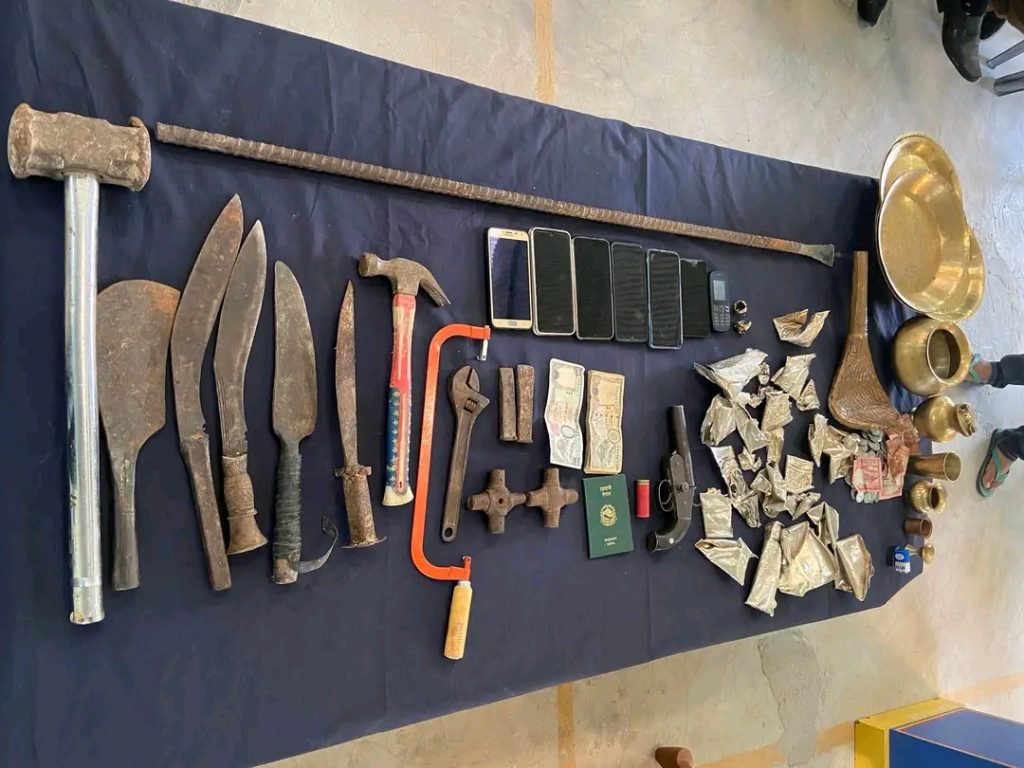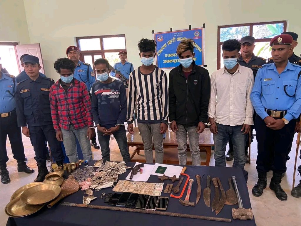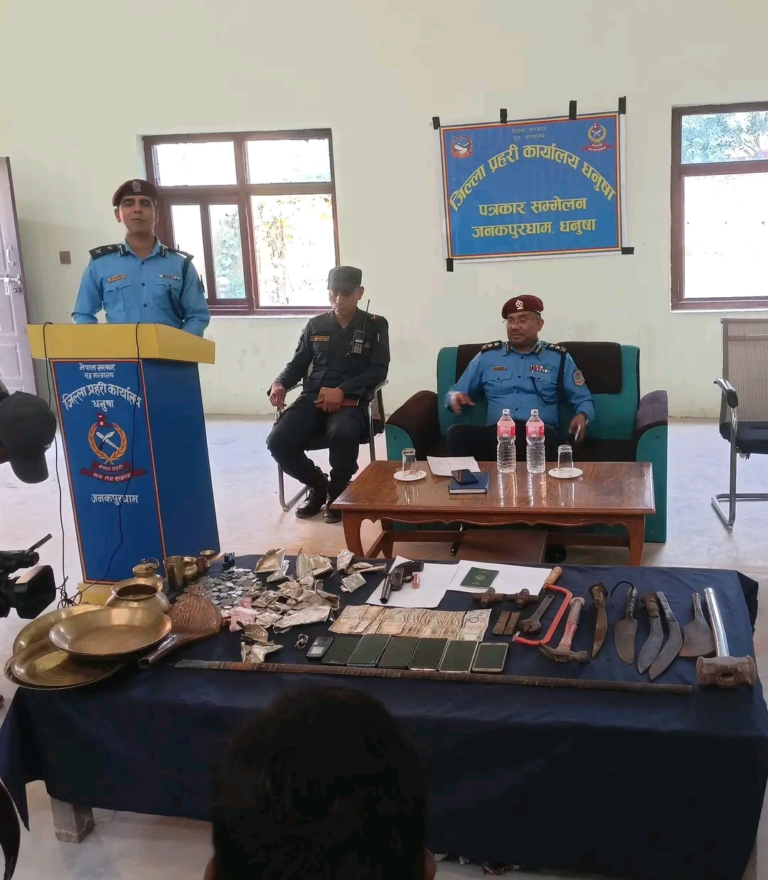 मिति २०७९/११/१४ गते राति अं. ००;१० बजेको समयमा जिल्ला धनुषा क्षिरेश्वरनाथ न.पा. वडा नं. १ रमदैया स्थित राजदेवी मन्दिरको ताला तोडी उक्त मन्दिरबाट देवीको चाँदीको मुर्ती, मुकुट अर्धवृत्त आकारको वस्तु (पाता), गिलास र सुनको मंटिका, नथिया, सिक्रि, कानको झुम्का लगायतको सुन चाँदीको सर-सामानहरू अज्ञात व्यक्तिहरुको समुहले चोरी गरी भागी फरार भएको भन्ने खबर ऐ. १४ गते बिहान ०५;०० बजेको समयमा प्राप्त हुनासाथ उक्त स्थानमा ई.प्र.का. महेन्द्रनगर र जि.प्र.का. धनुषाबाट अनुसन्धान सहितको मुचुल्का टोली खटि गई मुचुल्का कार्य सम्पन्न पश्चात अनुसन्धानको क्रममा सोही मन्दिरमा जडान भएको सि.सि.टि.भि. फुटेज तथा भिडियोहरुको सुक्ष्म विश्लेषण गरी उक्त सि.सि. टि.भि. फुटेज तथा Human Intellegence को सहायताले चोरी कार्यमा संलग्न मानिसहरूको पहिचान गरी निजहरुको खोज तलास गर्ने क्रममा मिति २०७९/११/१९ गते वेलुका २१;३० बजेको समयमा जिल्ला प्रहरी कार्यालय धनुषाबाट खटिएको बिशेष अनुसन्धान टोलीले जिल्ला धनुषा विदेह न.पा. वडा नं. ४ ठाडि स्थितबाट उक्त घटनामा संलग्न जि.धनुषा क्षिरेश्वर न.पा. वडा नं. ४ बस्ने बर्ष ३० को सरिफ मुसलमानलाई नियन्त्रणमा लिई तत्काल निजको सूचनाका आधारमा पूर्ण योजनावद्ध तवरले भारत तर्फ फरार हुन लागेको अवस्थामा धनुषा जनकनन्दनी गा.पा. वडा नं. ३ महुवा स्थित भारतीय सिमा नजिक रेल्वे ट्याकको बाटो हुँदै भारत तर्फ जाँदै गरेको अबस्थामा ऐ. २३;५० बजेको समयमा जिल्ला धनुषा क्षिरेश्वर न.पा. वडा नं. ५ महेन्द्रनगर बस्ने बर्ष ३७ को रजाक मोहमद, जिल्ला धनुषा विदेह न.पा. वडा नं. ४ सुन्दरपुर बस्ने बर्ष २१ को मोहमद हबगुल्ला साह, जिल्ला धनुषा कमला न.पा. वडा नं. ७ हथमुन्डा बस्ने बर्ष २२ को रमेश कुमार महतो, जिल्ला धनुषा विदेह न.पा. वडा नं. ४ बस्ने बर्ष २२ को नर्सुदिन साह समेतलाई मन्दिरबाट चोरी भएका निम्न सामानहरु सहित नियन्त्रणमा लिई यस कार्यालयमा ल्याई उक्त घटनामा प्रयोग गरेका कटुवा पेस्तोल थाना -१ र ऐ. मा लाग्ने गोली थान-१ समेत बरामद गरी यस कार्यालयमा ल्याई थप अनुसन्धान कार्य भईरहेको साथै निजहरूको समूहले नै जनकपुर उप.म.न.पा. १२ कुवा स्थित हनुमान मन्दिरमा समेत चोरी गरेको भन्ने बुझिएकोमा थप अनुसन्धान कार्य भइरहेको ।